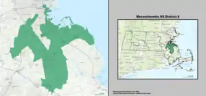 Le 8e district du Congrès du Massachusetts est situé dans l'est du Massachusetts, y compris une partie de Boston. Il est représenté par le Démocrate Stephen Lynch. Pendant un mandat au Congrès (1791–1793), il a servi de district d'origine du District du Maine. Les limites des districts ont été considérablement modifiées, à partir des élections de 2012, en raison du redécoupage après le recensement de 2010, l'ancien 8e district étant en grande partie déplacé vers le nouveau 7e district[1]. Le nouveau 8e district comprend de nombreuses communautés de l'ancien 9e district, ainsi que certaines communautés les plus à l'est du comté de Norfolk et les communautés les plus au nord du comté de Plymouth de l'ancien 10e district.