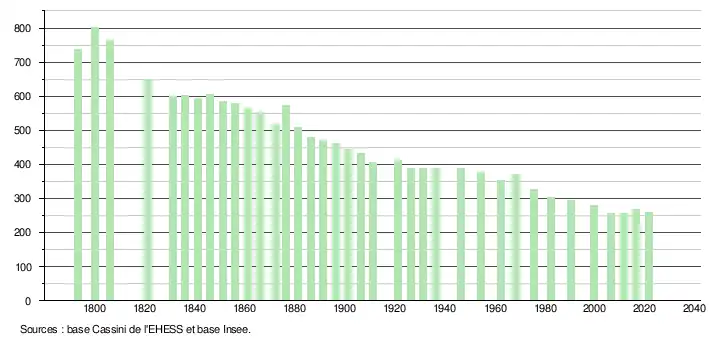 L'évolution du nombre d'habitants est connue à travers les recensements de la population effectués dans la commune depuis 1793. Pour les communes de moins de 10 000 habitants, une enquête de recensement portant sur toute la population est réalisée tous les cinq ans, les populations légales des années intermédiaires étant quant à elles estimées par interpolation ou extrapolation[17]. Pour la commune, le premier recensement exhaustif entrant dans le cadre du nouveau dispositif a été réalisé en 2006[18].