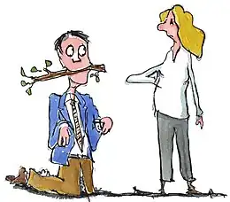 - de passer au statut inférieur, comme les animaux (chien ou cheval) ou les bébés/enfants en bas âge[5],[3] ;