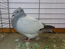 Ce gros pigeon d'aspect fier présente une allure robuste ; il mesure de la pointe du bec à l'extrémité de la queue de 39 à 42 centimètres et jusqu'à 750 grammes pour le mâle et 650 grammes pour la pigeonne[4]. Sa tête est grande et longue au front arrondi sur un cou puissant. Son dos est large et incliné vers l'arrière. Son bec est long et grêle. La principale caractéristique de cette race est sa coquille de plumes, arrondie derrière la tête et se terminant par des rosettes de chaque côté. Le sommet de la coquille dépasse la tête de 8 à 12 millimètres[4].