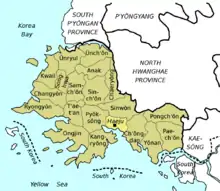 - (en) Cet article est partiellement ou en totalité issu de l’article de Wikipédia en anglais intitulé « South Hwanghae Province » (voir la liste des auteurs).