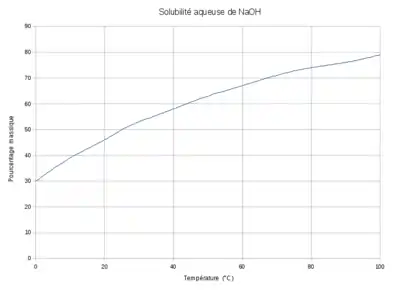 La solubilité de l'hydroxyde de sodium caustique dans l'eau augmente avec la température, à pression constante ou ambiante[9]. Elle est de 1 090 g/l à 20 °C (solution à 50 %) et atteint 3 137 g/l à 80 °C[10].