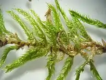 Rameau d'Hypnum cupressiforme vu de dessus. L'espèce est seconde, donc les pointes des feuilles ne sont pas visibles puisqu'elles sont toutes dirigées vers le bas.