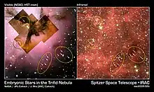 Les étoiles se formeraient à l'intérieur de nuages géants d'hydrogène moléculaire froid, des nuages moléculaires géants d'environ 300 000 masses solaires et 20 parsecs (pc) de diamètre[1],[32]. Au cours des millions d'années, les nuages moléculaires géants sont susceptibles de s'effondrer et de se fragmenter[33]. Ces fragments forment alors de petits noyaux denses, qui avec le temps formeront des étoiles[32]. La masse de ces noyaux varie entre une fraction jusqu'à plusieurs fois celle du Soleil (M☉) et sont appelées nébuleuses protostellaires (ou protosolaires)[1]. Elles possèdent un diamètre de 0,01 à 0,1 pc (2 000 à 20 000 UA) et une densité de particules (en) d'environ 10 000 à 100 000 par cm3[note 1],[32],[34]. L'effondrement initial d'une nébuleuse protostellaire d'une masse solaire prend environ 100 000 ans[1],[32]. Chaque nébuleuse commence avec une certaine quantité de moment cinétique. Le gaz dans la partie centrale de la nébuleuse, avec un moment cinétique relativement bas, passe par une période de compression rapide et forme un noyau chaud hydrostatique (qui ne se contracte pas) contenant une petite fraction de la masse de la nébuleuse originelle[35]. Ce noyau deviendra l'étoile[1],[35]. Alors que l'effondrement continue, la conservation du moment cinétique amène l'accélération de la rotation de l'enveloppe tombante[36],[37], ce qui empêche grandement le gaz de s'amalgamer directement sur le noyau central. Au lieu de s'amalgamer, le gaz est forcé de s'étendre vers l'extérieur, près de son plan équatorial, formant un disque[1],[36],[37]. Le noyau s'agrandit graduellement et sa masse augmente jusqu'à ce qu'il devienne une jeune protoétoile chaude[35]. À ce stade, la protoétoile et son disque sont grandement obscurcis par l'enveloppe qui dégonfle et ne sont donc pas directement observables[15]. En fait, l'opacité de l'enveloppe restante est si grande que même les radiations d'une longueur d'onde de l'ordre du millimètre ont de la difficulté à s'en échapper[1],[15]. De tels objets sont observés comme des condensations très lumineuses qui émettent principalement des ondes d'ordre millimétrique, ou même plus petites[34]. Elles sont classifiées comme protoétoiles de classe spectrale 0[15]. L'effondrement est souvent accompagné par des jets bipolaires qui émanent près de l'axe de rotation du disque. Les jets en général sont d'ailleurs fréquemment observés dans des régions de formations d'étoiles (voir objet Herbig-Haro)[38]. La luminosité des protoétoiles de classe 0 est élevée. Ainsi, par exemple, une protoétoile d'une masse solaire peut radier à plus de 100 luminosités solaires. La source de cette énergie est l'effondrement gravitationnel, alors que leurs noyaux ne sont pas encore assez chauds pour commencer la fusion nucléaire[35],[39].