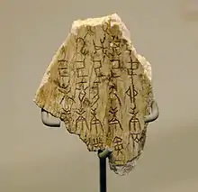 - Vers 1300-1046 av. J.-C. : les rois de la dynastie Shang installent leur capitale, Yin, près d’Anyang[56]. Les enceintes disparaissent et la fonction cultuelle et cérémonielle des villes l’emporte sur l’aspect guerrier. Les imposantes tombes royales Shang, en forme de fosses cruciformes renfermant des chars livrent des objets en bronze, en ivoire et en jade, ainsi que les restes des corps de plusieurs dizaines de morts d’accompagnement, ce qui témoigne de la puissance des rois Shang. On a découvert à Anyang les premières inscriptions chinoises sur des carapaces de tortue où des os oraculaires (Jiaguwen) qui font état des pratiques divinatoires, qui avec la production de bronze sont le fondement du pouvoir des rois Shang[53].
