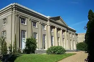 La rotonde est flanquée d'ailes étroites segmentaires à un étage (apparaissant comme une arcade aveugle) reliant, à la manière palladienne, à deux pavillons terminaux; ces ailes segmentaires sont brisées en leur centre par des baies en saillie qui abritent le fumoir et la salle pompéienne, tous deux ajoutés plus tard au XIXe siècle.