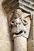 - Les modillons figurés sont des petits blocs de pierre sculptés, d'environ 20 cm de large sur 30 cm de haut, soutenant une corniche. Ils sont ornés de dessins plus ou moins abstraits, comme des entrelacs, des damiers, des feuilles, etc. ou de représentations profanes. On ne trouve pas de scènes tirées de la Bible comme pour les chapiteaux. Les personnages grotesques ou les animaux mythologiques sont issus des bestiaires comme le Physiologus[Notes 1]. Les personnages humains peuvent exercer des activités telles que jouer d'un instrument de musique ou, souvent, des activités résolument sexuelles.