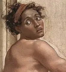 Dans son premier projet pour la voûte, Michel-Ange avait prévu de peindre des anges pour accompagner les figures des douze apôtres initialement envisagés. Les Ignudi, même dépourvus d'ailes, s'interprètent aussi comme les successeurs de ces anges (Emison, 1998). L'œuvre de Michel-Ange présente d'ailleurs des précédents montrant des êtres non ailés que leur ambivalence permet d'interpréter comme des anges, comme par exemple les figures à l'arrière-plan de la Vierge à l'escalier et les anges sans ailes de la Création d'Adam[1].