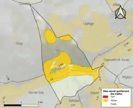 Les mouvements de terrains susceptibles de se produire sur la commune sont soit des chutes de blocs, soit des glissements de terrains, soit des mouvements liés au retrait-gonflement des argiles. Près de 50 % de la superficie du département est concernée par l'aléa retrait-gonflement des argiles, dont la commune d'Illier-et-Laramade[39]. L'inventaire national des cavités souterraines permet par ailleurs de localiser celles situées sur la commune[40].