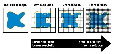 Les images satellites d'une résolution de moins d'un mètre permettent de reconnaitre de nombreux objets comme les bâtiments, les forêts, les vergers, les champs, les barrières, les rivières, les chemins de fers, et les routes[3].