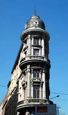 Cet immeuble très étroit présente au sud, orienté vers la place de Brouckère, « un élément d'angle circulaire orné de balcons et couronné d'une coupole »[1].