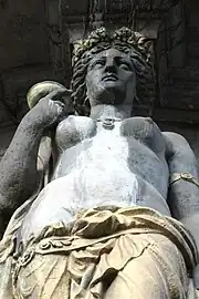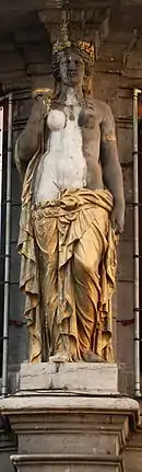 Au bel étage, quatre cariatides d'Antoine Bouré et Hippolyte Le Roy, beaucoup plus réussies selon Pierre Loze que celles qui ornent la façade du Café Métropole de Gédéon Bordiau, soutiennent le balcon[1]. Prolongeant les pilastres du niveau inférieur, ces cariatides portent des ornements dorés consistant en couronnes, coupes, colliers, ceintures et tuniques au drapé élégant.