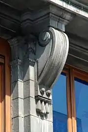 Le premier étage de la tour d'angle est orné d'un balcon arrondi et de colonnes engagées aux chapiteaux ioniques encadrant un premier niveau de fenêtres surmontées d'un entablement soutenu par des consoles moulurées à motif de gouttes et d'un fronton brisé portant un cartouche sculpté et un deuxième niveau de fenêtres à entablement simple.