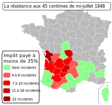 L'impôt des 45 centimes, fortement impopulaire, détache une bonne partie des paysans de la République naissante au moment des élections à l'Assemblée nationale. Le gouvernement doit consentir des dégrèvements pour les petits imposables et se garde d'en exiger la perception jusqu'aux élections. Ce n'est qu'après les élections du 23 avril que la résistance s'amplifie. L'échec du général Louis Eugène Cavaignac à l'élection présidentielle de 1848 est en partie dû au fait que le gouvernement républicain, qu'il préside entre juin et , n'abolit pas cet impôt et en exige fermement la perception, avec l'aide de l'armée (système des soldats dits « garnissaires »).