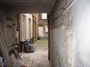 Au XVIIIe siècle on l'appelait parfois également "allée du Dragon de Fer"[2] car lors du bombardement de 1695, la maison du Dragon, située rue du Marché aux Fromages, avait été détruite et sur son emplacement ainsi que sur celui de la maison à sa droite appelée den Cleijnen Draeck appelée ensuite de Witte Roose, avait été construite en 1709 sur un grand terrain[3] une nouvelle belle et grande maison (een groote schone nieuwe huys) appelée "Den Eyseren Draeck" ou "Dragon de Fer" d'où pendait comme disent les wijckboecken un dragon de fer: "waer hangt een eyseren draeck"[4]. Cette vaste maison de maître située aux actuels n°15 et 17 a été entièrement défigurée en 1882 quand son rez-de-chaussée a été transformé en rez-de-chaussée commercial et sa façade déformée.