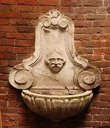 Le mur du fond était orné d'une statue de la Vierge en terre cuite, disparue et brisée vers le , et d'une vasque en pierre blanche ornée d'une tête d'homme et de deux volutes baroques.
