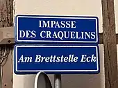 À partir de 1995, des plaques de rues bilingues, à la fois en français et en alsacien, sont mises en place par la municipalité lorsque les noms de rue traditionnels étaient encore en usage dans le parler strasbourgeois[6]. Le nom de l'impasse est ainsi sous-titré Am Brettstelle Eck.
