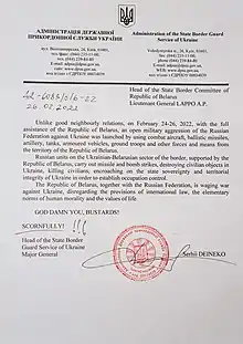 Le 26 février, le chef du Service national des gardes-frontières d'Ukraine, Serhi Deyneko, écrit une lettre officielle au chef du Comité des frontières d'État du Bélarus Anatoly Lappo, accusant son organisation d'aider la Russie à envahir l'Ukraine par le nord[150]. Certains députés de la Verkhovna Rada, le parlement ukrainien, appelle à rompre les relations diplomatiques avec son voisin du nord[151].