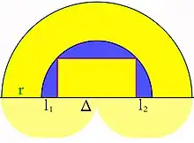 On découpe alors la surface Z en deux par une droite Δ passant par les centres des deux cercles inscrit et circonscrit. La partie supérieure de Z est notée Zs, comme indiquée sur l'illustration à droite. La somme de Minkowski de Zs et de rB correspond, dans la partie supérieure à la droite Δ, à un demi-disque, de rayon R + r. Si l1 et l2 sont les longueurs des deux intersections de Z avec Δ (voir la figure), l'intersection de la somme avec la partie inférieure à la droite Δ possède une aire égale à πr2 + (l1 + l2)r. On en déduit l'égalité :