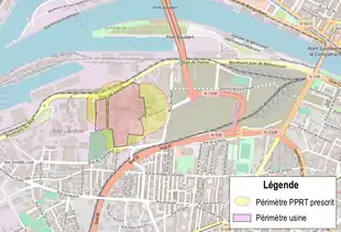 Conformément à la loi[Note 3], tout établissement Seveso à « haut risque » (dits AS) met en œuvre un plan de prévention des risques technologiques (PPRT) ; il vise à résoudre les situations difficiles en matière d'urbanisme héritées du passé et à mieux encadrer l'urbanisation future. L'exploitant met en œuvre toutes les mesures de sécurité envisageables pour atteindre un niveau de risque aussi bas que possible, compte tenu de l'état des connaissances et des pratiques et de la vulnérabilité de l'environnement de l'établissement : on parle de réduction du risque à la source. Le PPRT comporte des dispositions pour les constructions exposées au risque. Le PPRT relatif à l’usine de Rouen a été prescrit le [22] et approuvé le [23]. Les contraintes liées au PPRT s’imposent aux plans locaux d’urbanisme des communes concernées (Rouen et Petit-Quevilly).
