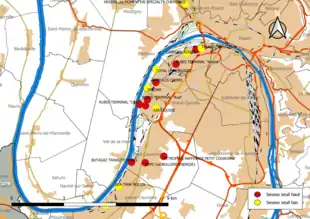 - Le préfet, qui élabore le Plan particulier d'intervention (PPI) pour faire face à un sinistre dont les conséquences dépassent les limites de l’établissement[31]. Le préfet est alors directeur des opérations de secours. La finalité de ce plan de secours est de protéger la population voisine des effets du sinistre. Ce plan, annexé au dispositif ORSEC départemental, définit le rôle de chacun des acteurs du risque majeur en cas d’accident grave. Le PPI est obligatoire pour tous les établissements classés Seveso « seuil haut ». Compte tenu de la densité du tissu industriel, et afin de prendre en compte les effets de réaction en chaîne qui pourraient en résulter, des PPI dits « de zone » ont été arrêtés pour la zone de Rouen, qui concerne vingt établissements dont l'entreprise Lubrizol[32], mais aussi pour les zones du Havre, d'Elbeuf, de Port-Jérôme et de Caudebec-en-Caux.