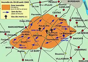 Du au , le massif forestier des Landes de Gascogne est victime d'un grand feu de forêt qui ravage 52 000 hectares dont 25 000 de bois, et entraîne la mort de 82 personnes[1],[2]. Les communes touchées sont Cestas, Saucats, Marcheprime et Mios, en Gironde.
