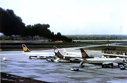 L'incendie du Boeing 737 de British Airtours à destination de Corfou, en Grèce (vol KT28M) s'est produit le sur l'aéroport de Manchester (Angleterre). Le Boeing 737-200 exploité par British Airtours (en), compagnie charter filiale de British Airways, subit une panne du moteur gauche : un élément du réacteur a perforé un réservoir d'aile et le kérosène qui s'en échappe provoque immédiatement un incendie. Le commandant de bord de l'avion interrompt le décollage et ordonne l'évacuation, mais le feu qui se propage à la cabine fait 55 morts et 15 blessés parmi les 137 personnes à bord, la plupart en raison de l'inhalation de fumées.