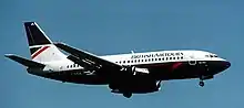 L'appareil impliqué dans l'accident (G-BGJL), un Boeing 737-200 anciennement nommé Goldfinch, ici photographié plus de 3 ans avant l'accident, et avant qu'il ne reçoive une nouvelle livrée. | |||