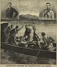 La tentative d'assassinat se déroula dans la ville d'Ōtsu le alors que Nicolas revenait à Kyoto après être parti voir le lac Biwa. Il fut alors subitement attaqué par Tsuda Sanzō, l'un des policiers de son escorte, qui le frappa à deux reprises à la tête avec un sabre, le blessant à l'arrière de la tête et au front[2]. Le prince Georges de Grèce, le cousin de Nicolas para un autre coup avec sa canne, sauvant la vie du Tsarévitch[2].