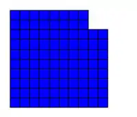 Recherchons maintenant la géométrie d'un rectangle d'aire 96 et de périmètre 40. Si cette surface était un carré, comme son périmètre est 40, son côté serait 10. L'aire est trop grande puisqu'elle vaut 100, au lieu de 96 et elle dépasse de 4. Retranchons au carré d'aire 100, un petit carré d'aire 4 et donc de côté 2. On obtient un gnomon illustré sur la figure de gauche.