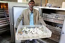Le succès de l'incubation commence par la collecte méticuleuse des œufs dans les nids, par une bonne conservation des œufs avant l'incubation et enfin par le maintien de la température durant toute la durée de l'incubation. Du fait de la durée de couvaison, les œufs doivent être stockés en chambre froide et doivent régulièrement être retournés. Cette durée de stockage influe grandement sur l'éclosabilité des œufs. Une fumigation, protégeant l'œuf des agents pathogènes présents sur sa coquille augmente la chance de survie de l'œuf. Enfin, ils sont préchauffés avant d'être à proprement parler incubés. Les producteurs de poussins utilisent deux types d'appareillage pour l'incubation, les appareils d'incubation ventilée, et les appareils d'incubation statique, ces derniers étant plus rudimentaires. Durant l'incubation, les besoins de l'embryon en dioxygène sont élevés. Les œufs sont éventuellement mirés par les aviculteurs afin d'écarter les œufs morts.
