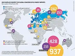 Pour sa production électrique nucléaire, EDF se fournit essentiellement en combustible auprès d'Orano, lequel importe en 2020 de l'uranium du Niger (pour 35 %), du Kazakhstan (pour 29 %), de l'Ouzbékistan (pour 26 %) et de l'Australie (pour 10 %)[7].