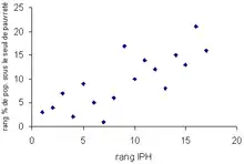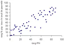 Statistiquement, les deux indicateurs sont bien corrélés, les revenus ont une influence considérable sur le niveau de pauvreté, sans doute en raison de la carence des services publics. Par contre, l'estimateur de l'écart type est important, une valeur de 13 rangs signifiant que si l'on considère un pays au hasard, on a une chance sur deux que les l'écart entre les rangs soient supérieur à 18[3]. La faiblesse des revenus constitue donc un élément prépondérant de la pauvreté des pays en développement, mais n'est pas un élément d'appréciation suffisant.