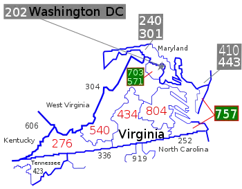 Carte de la Virginie avec les territoires de ses indicatifs régionaux. L'indicatif régional 540 se trouve au nord-ouest de l'État.