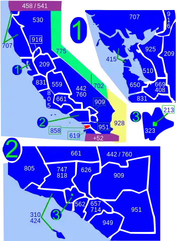 Carte de l'État de Californie avec les territoires de ses indicatifs régionaux. L'indicatif régional 858 est en rouge.