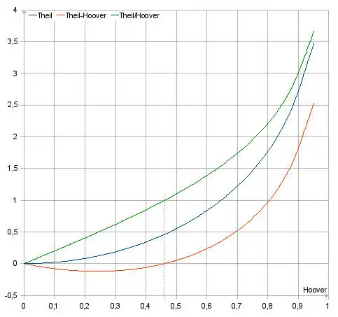 La moyenne est très convenable par comparaison avec le plus simple des indices d'inégalité : l'indice de Hoover. La différence est indiquée par la couleur bleue.