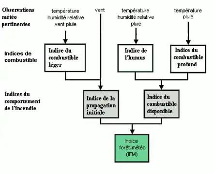 L'indice forêt-météo est calculée à partir de cinq composantes qui tiennent compte des effets de la teneur en eau des combustibles et du vent sur le comportement des incendies. Les trois premières composantes sont des indices d'humidité des combustibles et les deux autres sont des indices de comportement du feu[3].