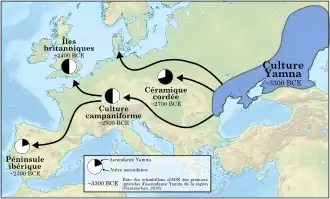 D'autres études viennent préciser l'étendue de ces migrations. En 2018, David Reich et son équipe montrent qu'une migration massive survenue il y a environ 4 500 ans (vers ) depuis le continent vers la Grande-Bretagne introduit la culture campaniforme dans l'île. La propagation de la culture campaniforme est associée au remplacement d'environ 90 % du patrimoine génétique existant en quelques centaines d'années. Selon cette étude, cette migration se produit dans le prolongement de l'expansion vers l'ouest qui avait amené l'ascendance liée à la culture Yamna en Europe centrale et du nord au cours des siècles précédents[58].