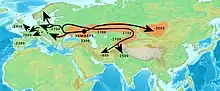 - séparation entre le proto-indo-européen commun et le tokharien entre 3 700 et 3 300[122] avant J.-C. ;