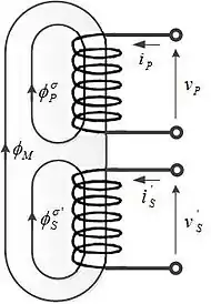 Les équations de maillage du transformateur non idéal peuvent être exprimées par les équations de tension et de liaison de flux suivantes[21] :