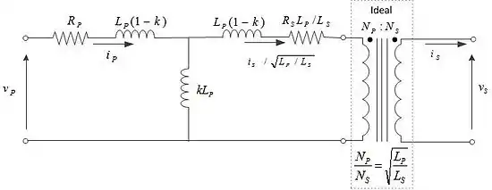 Un transformateur linéaire non idéal à deux enroulements peut être représenté par deux boucles de circuit à couplage d'inductance mutuelle reliant les cinq constantes d'impédance du transformateur, comme le montre la figure 2[7],[17],[18],[19] :