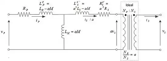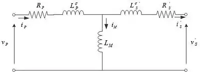 Le transformateur peut être exprimé de manière plus pratique comme le circuit équivalent (en) de la figure 3 avec des constantes secondaires référencées (c'est-à-dire avec une notation en exposant) au primaire[26],[27] :