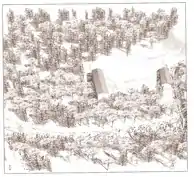 - Premiers bâtiments construits à l’abbaye du Thoronet, c’est-à-dire une porterie à droite et l’ancien cellier à gauche servant de dortoir aux moines. Image extraite de Le Thoronet, une abbaye cistercienne, Yves Esquieu, éd. Actes Sud, Paris, 2006