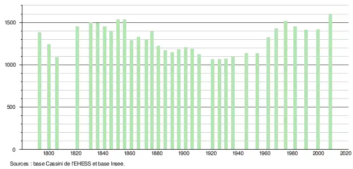 L'évolution du nombre d'habitants est connue à travers les recensements de la population effectués dans la commune depuis 1793. À partir du , les populations légales des communes sont publiées annuellement dans le cadre d'un recensement qui repose désormais sur une collecte d'information annuelle, concernant successivement tous les territoires communaux au cours d'une période de cinq ans. Pour les communes de moins de 10 000 habitants, une enquête de recensement portant sur toute la population est réalisée tous les cinq ans, les populations légales des années intermédiaires étant quant à elles estimées par interpolation ou extrapolation[24]. Pour la commune, le premier recensement exhaustif entrant dans le cadre du nouveau dispositif a été réalisé en 2008[25],[Note 2].