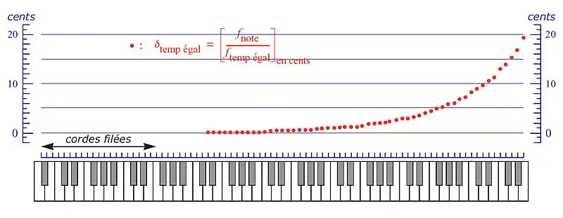 On constate que le piano n'est pas du tout accordé au tempérament égal, contrairement à ce que l'on dit souvent, du moins au tempérament égal au sens d'un accordeur électronique (avec des octaves au rapport 2/1). Dans la partie supérieure du plan des cordes, l'écart au tempérament égal est d'autant plus important qu'on monte plus haut dans l'aigu du piano. Dans le registre bas médium et médium, les cordes ont très peu de raideur, les partiels sont pratiquement harmoniques, il ne faut pas dilater les octaves. Dans l'aigu, à partir de 1 000 Hz, on sait qu'un son pauvre en harmoniques sonne trop bas (voir : Échelle de Mel) : remonter les fréquences de l'aigu du piano n'est pas, pour cette raison, psychoacoustiquement gênant. Un piano qui serait accordé au tempérament égal sonnerait faux, particulièrement dans l'aigu.