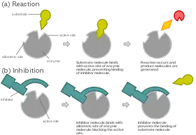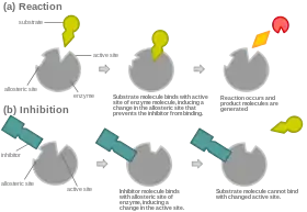 La plupart des inhibiteurs compétitifs agissent en se liant de manière réversible au site actif de l'enzyme, ce qui conduit souvent à des simplifications excessives dans la description du phénomène ; en réalité, il existe de nombreux mécanismes par lesquels une enzyme peut se lier à un substrat, à un inhibiteur, mais pas aux deux en même temps. Par exemple, les inhibiteurs allostériques peuvent exercer une inhibition compétitive, non compétitive ou incompétitive[1].