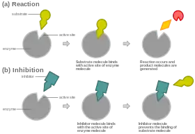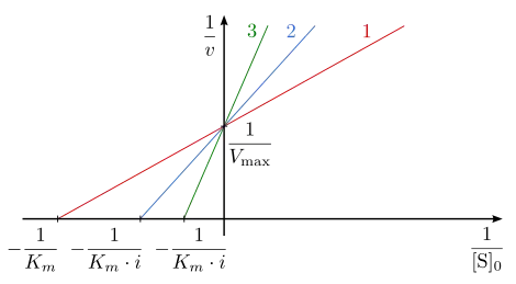 Dans le cas d'une inhibition compétitive, une enzyme peut, à chaque instant, être liée à son substrat, à son inhibiteur compétitif, ou à aucun d'entre eux, mais ne peut pas être liée à la fois à son inhibiteur et à son substrat.