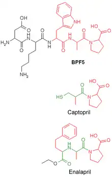 Les inhibiteurs de l’ECA tels que le captopril, l’énalapril et leurs substances successeurs ont une structure apparentée à celle du peptide isolé à partir du venin du serpent brésilien Jararaca - fer de lance (Bothrops jararaca), BPP5a (Peptide"" potentialisant la Bradykinine; voir figure). La séquence de tripeptides présente dans BPP5a et se composant de trois acides aminés Tryptophane-Alanine-Proline a été identifiée comme le composant efficace (représenté en rouge sur la figure).