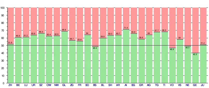 Le , alors que les sondages prédisaient un rejet de l'initiative, celle-ci est acceptée à la double majorité du peuple (57,5 % de votes favorables) et des cantons (19,5 cantons sur 23), pour un taux de participation de 53,76 %[23],[NB 2],[24]. Seuls Bâle-Ville (48,4 %), Neuchâtel (49,3 %), Vaud (46,9 %) et Genève (40,3 %) refusent le texte[25].