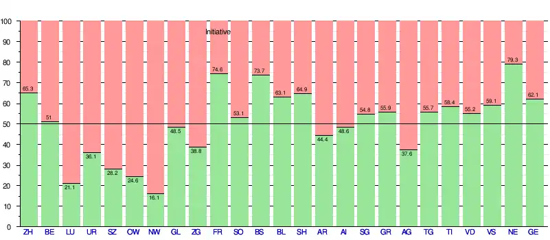 Initialement prévue le , la votation est reportée de plus de sept mois à la suite d'une épidémie de fièvre aphteuse[6]. Finalement soumise à la votation le , l'initiative est acceptée par 13 2/2 cantons[NB 3] et par 55,3 % des suffrages exprimés[7]. Le tableau ci-dessous détaille les résultats par cantons[8] :